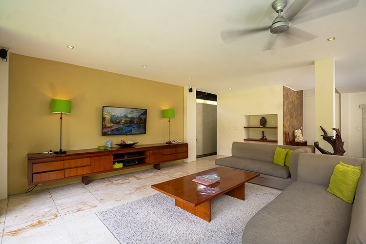 Expansive villa in a comfortable style, with the living and dining areas and one bedroom on the ground floor, looking out to the tropical garden & gazebo. Two bedrooms located on first level, both with ensuite bathrooms. Perfect for families or groups of friends. The large garden and pool area is ideal for sun bathing or children playing. Night garden lighting creates a beautiful natural ambience. When the sun sets, the pool lights reflect off the lush planting helping you relax and drift into the holiday mood.